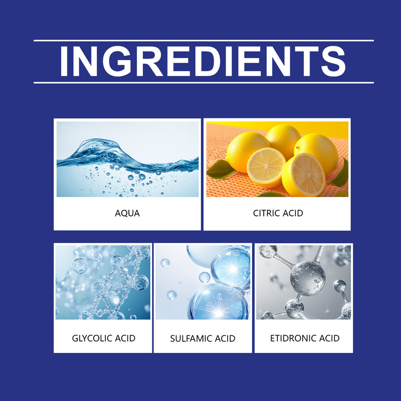 רכיבים עיקריים: מים, חומצת לימון, חומצה אמידו-סולפונית, חומצה גליקולית, חומצה הידרוקסי-אתילן דיפוספונית